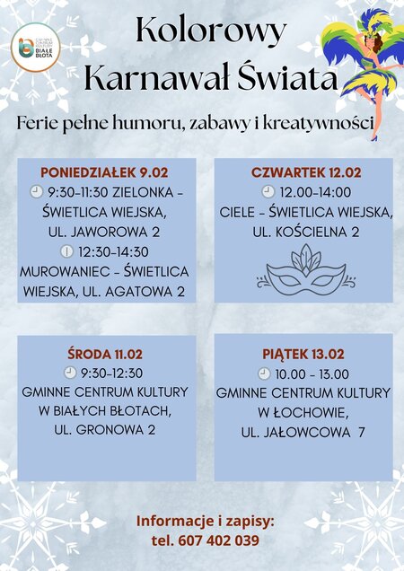 Zapraszamy dzieci na zajęcia w ramach bloku „Kolorowy Karnawał Świata”, które odbędą się w Gminnym Centrum Kultury w Białych Błotach oraz w Łochowie, a także w świetlicach wiejskich w: Cielu, Zielonce i Murowańcu (szczegóły na załączonym plakacie).