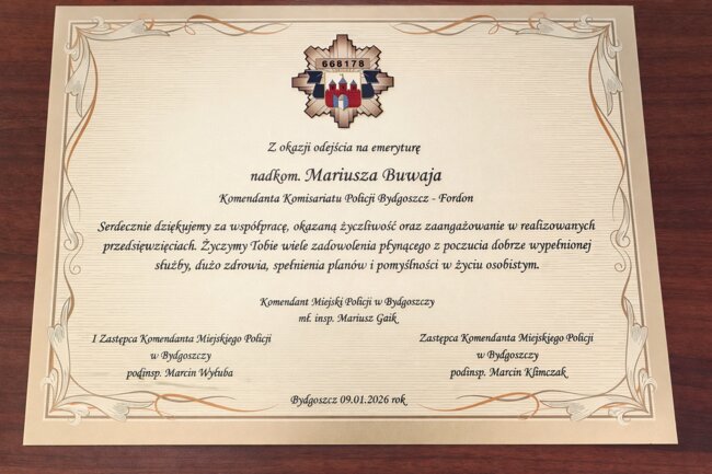 W miniony piątek (9.01.2026) policjanci z bydgoskiego Fordonu pożegnali się ze swoim dotychczasowym Komendantem nadkom. Mariuszem Buwajem. W uroczystej zbiórce uczestniczył Komendant Miejski Policji w Bydgoszczy młodszy inspektor Mariusz Gaik, który w swoim wystąpieniu podziękował odchodzącemu na emeryturę za lata służby, a także wkład w budowanie bezpieczeństwa i współpracę z mieszkańcami.