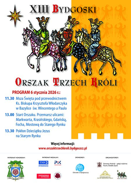 6 stycznia 2026 r. – Już po raz trzynasty Kacper, Melchior i Baltazar w strojach z epoki podążą #do Stajenki, by oddać pokłon Dzieciątku leżącemu w żłobie. Wraz z Mędrcami powędrują wszyscy uczestnicy Orszaku. Przejściu pochodu towarzyszyć będzie wspólne śpiewanie kolęd.