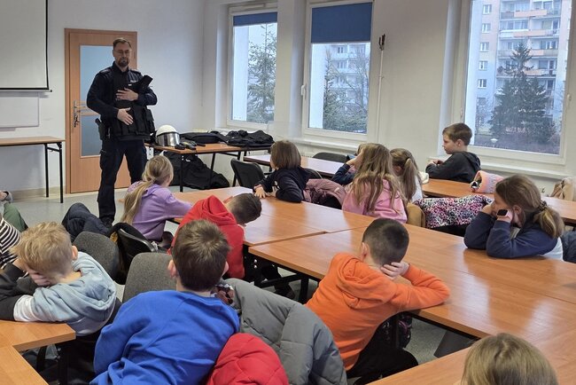 Wczorajsze (27.01.2026) spotkanie z drugoklasistami poprowadzili: Komendant Komisariatu Policji Bydgoszcz–Wyżyny nadkomisarz Grzegorz Trunk, młodszy aspirant Michał Nowakowski z zespołu profilaktyki społecznej oraz profilaktyk Anna Noworyta.