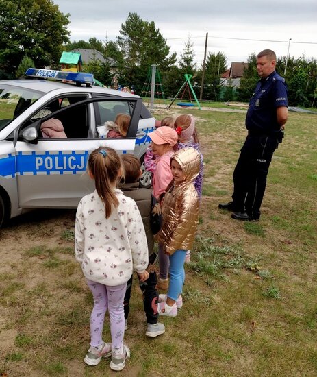 W miniony poniedziałek (22.09.2025), mali uczestnicy zajęć mieli okazję poznać bliżej pracę policjanta. Podczas spotkania dzielnicowy aspirant Michał Kaiser przypomniał przedszkolakom zasady bezpiecznego poruszania się po drodze, zwracając szczególną uwagę na prawidłowe przechodzenie przez przejścia dla pieszych oraz znaczenie sygnalizacji świetlnej. Policjant zaprezentował także, w jaki sposób pobiera się ślady linii papilarnych, a na zakończenie pokazał dzieciom policyjny radiowóz.