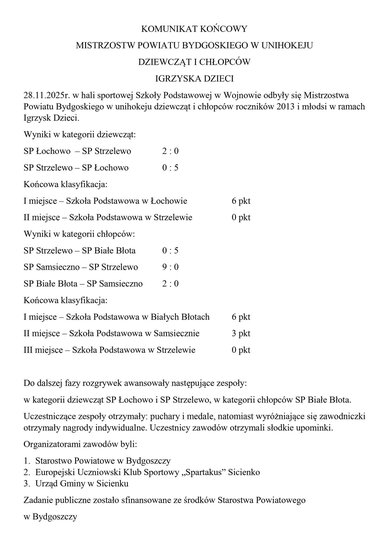 28 listopada 2025 r. w hali Szkoły Podstawowej w Wojnowie odbyły się Mistrzostwa #Powiatu Bydgoskiego w unihokeju dziewcząt i chłopców w ramach Igrzysk Dzieci oraz Igrzysk Młodzieży Szkolnej.
