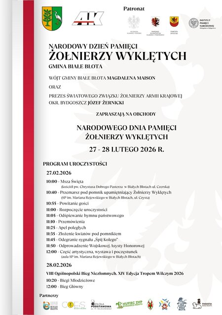 Serdecznie zapraszamy Mieszkańców Gminy Białe Błota do udziału w uroczystościach z# okazji Narodowego Dnia Pamięci Żołnierzy Wyklętych, które odbędą się 27–28 lutego 2026 roku.