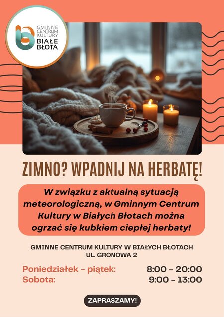 Zachęcamy do ogrzewania się w murach Gminnego Centrum Kultury w Białych Błotach przy ciepłej herbacie!